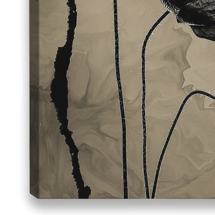 Image de coquelicot avec des tiges de graines, avec un fond de couleur naturelle écru.