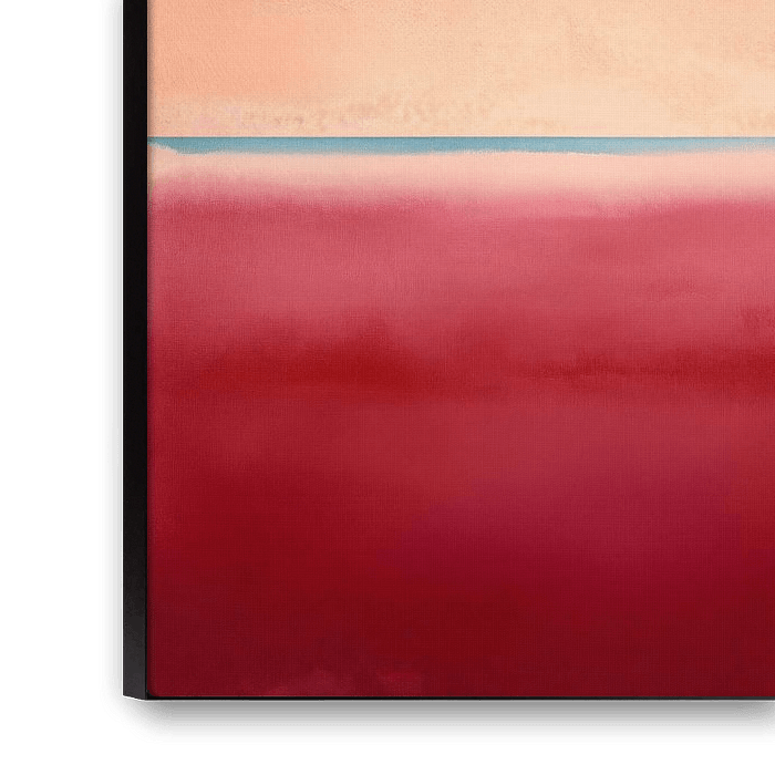 Une œuvre d'art abstraite et sereine qui joue avec des teintes chaudes de corail, de rose et de rouge profond, séparées par une subtile ligne d'horizon turquoise. Les douces transitions de couleurs et les textures vaporeuses créent une atmosphère onirique, presque méditative, rappelant un coucher de soleil mystique sur une mer exotique.