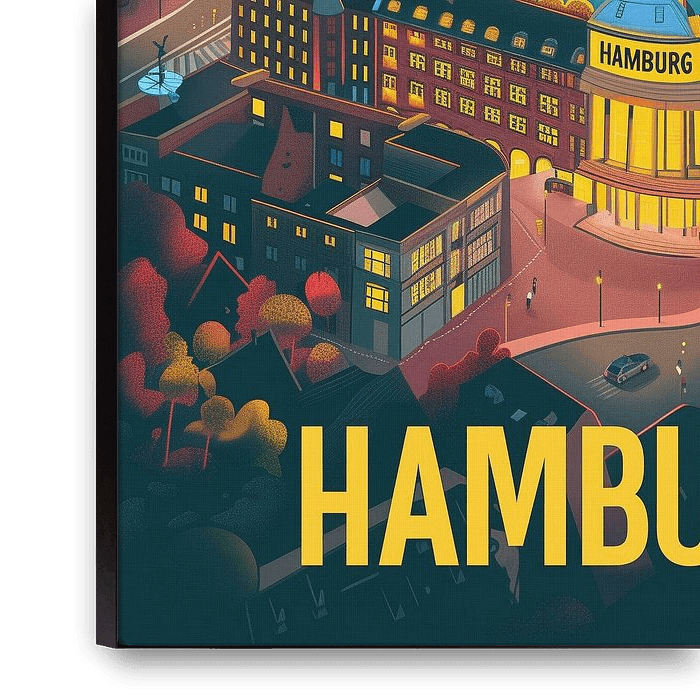 Transformez votre décor avec l'élégance urbaine du nord de l'Allemagne en mettant en vedette cette captivante affiche de voyage de Hambourg. L'image montre le stade de la ville brillant sous un coucher de soleil doré, entouré de canaux sinueux, de bâtiments historiques en briques rouges et de voiliers animés. Les couleurs du crépuscule…