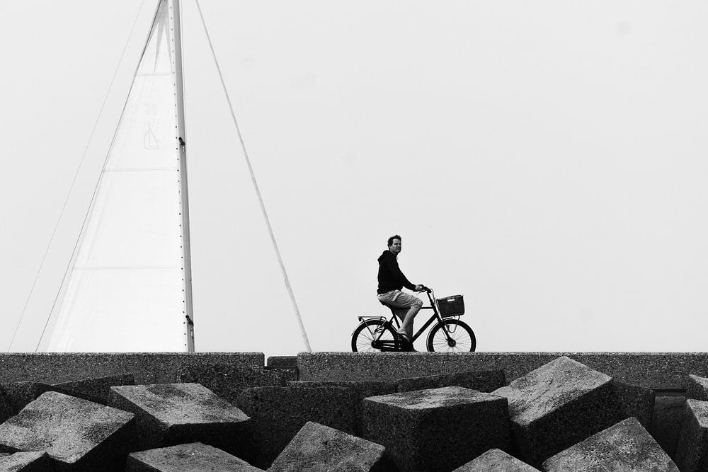 Cycliste sur le brise-lames nord de Scheveningen. Du voilier derrière le cycliste, seule la voile est visible. En noir et blanc.