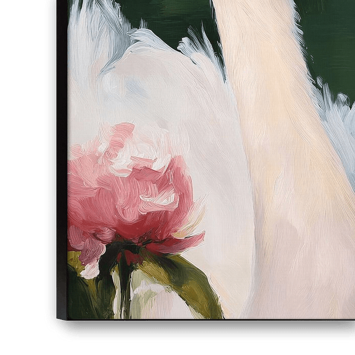 Un gracieux cygne blanc, au long cou caractéristique et au bec rose tendre, pose avec élégance parmi de luxuriantes roses roses sur un fond vert foncé. L'œuvre dégage une atmosphère romantique et sereine, les coups de pinceau délicats donnant vie aux plumes du cygne et aux délicats pétales de rose.