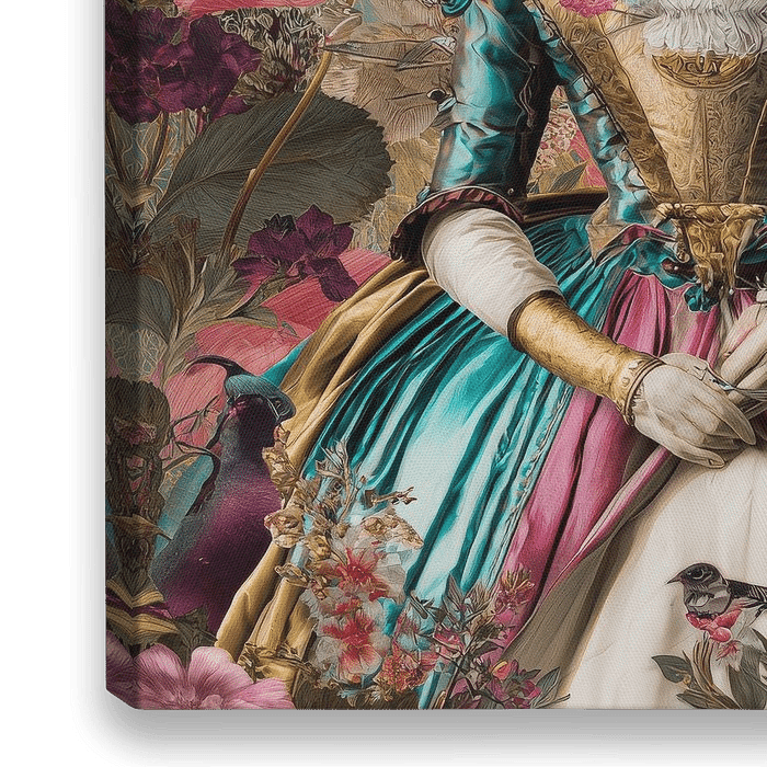 Ce collage artistique extravagant représente une élégante dame baroque entourée de fleurs, d'oiseaux et de détails dorés, dans une explosion de couleurs et de textures. Un hommage luxueux à la mode, à la nature et à l'histoire de l'art qui fera briller votre mur.