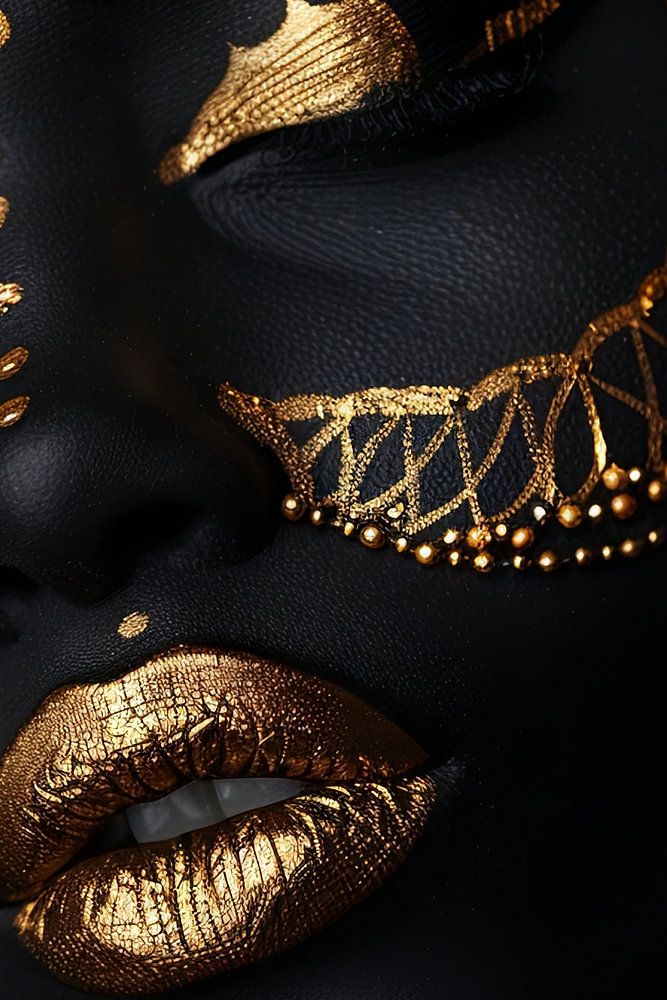 Ce portrait de femme à couper le souffle allie la profondeur sombre de la nuit aux reflets éclatants de l'or. Les ornements dorés élaborés qui ornent le visage et les lèvres créent un contraste fascinant et confèrent à l'image une aura de majesté et de mystère. Les détails soignés et les accents dorés chatoyants confèrent à la composition une élégance presque divine qui transporte le spectateur dans un monde de beauté mystique. Idéal pour les amateurs d'art classique et moderne qui souhaitent s'inspirer d'images profondes et puissantes.