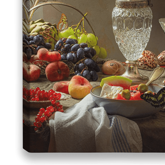 Nature morte de salade de pastèque dans une assiette creuse bleu-vert clair avec à gauche un plat en argent avec des baies rouges. Derrière elle, des pêches et des raisins sur une coupe à fruits en cristal. Ensuite, au milieu, une carafe en cristal avec de l'argenterie et, à droite, un verre en cristal sur pied et une carafe avec de la…