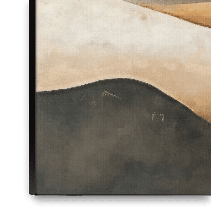 Cette œuvre se déploie en plans doux et inclinés. Chaque couche glisse silencieusement sur la suivante, comme la brume sur un paysage. La palette est terreuse : vert olive profond, beige miel et blanc sable se fondent l'un dans l'autre.