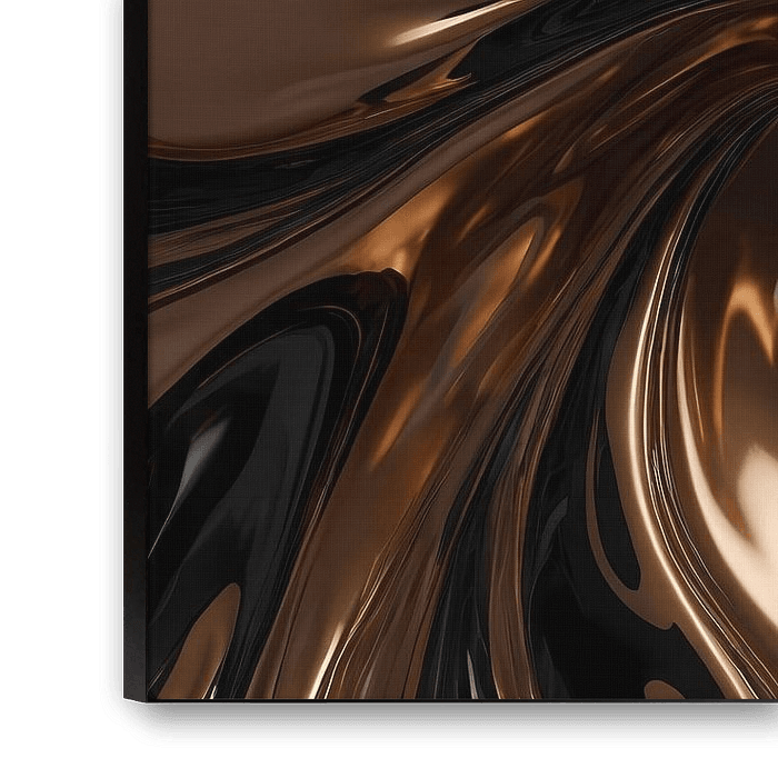 Ce design dynamique avec une fusion de tons bronze et or sur un fond noir profond apporte une atmosphère moderne et luxueuse à n'importe quelle pièce. Le jeu d'ombre et de lumière dans les lignes fluides et douces rappelle les mouvements naturels de l'eau ou du métal en fusion. L'œuvre d'art peut servir de pièce d'affirmation puissante dans une chambre à coucher au design minimaliste ou de toile de fond inspirante dans un bureau élégant. La superposition et la profondeur de l'œuvre invitent le spectateur à découvrir de nouvelles formes et de nouvelles significations à chaque fois. Cette pièce ne déparerait pas dans une galerie d'art contemporain, car elle permet d'engager la conversation en enrichissant l'espace et en stimulant l'imagination.