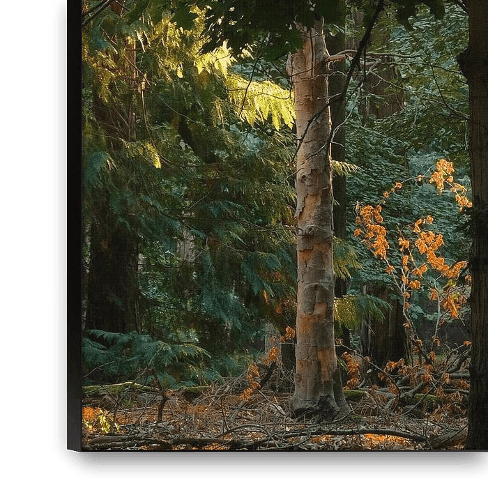La lumière de la fin de l'été tombe doucement dans une forêt avec différentes espèces d'arbres aux Pays-Bas.