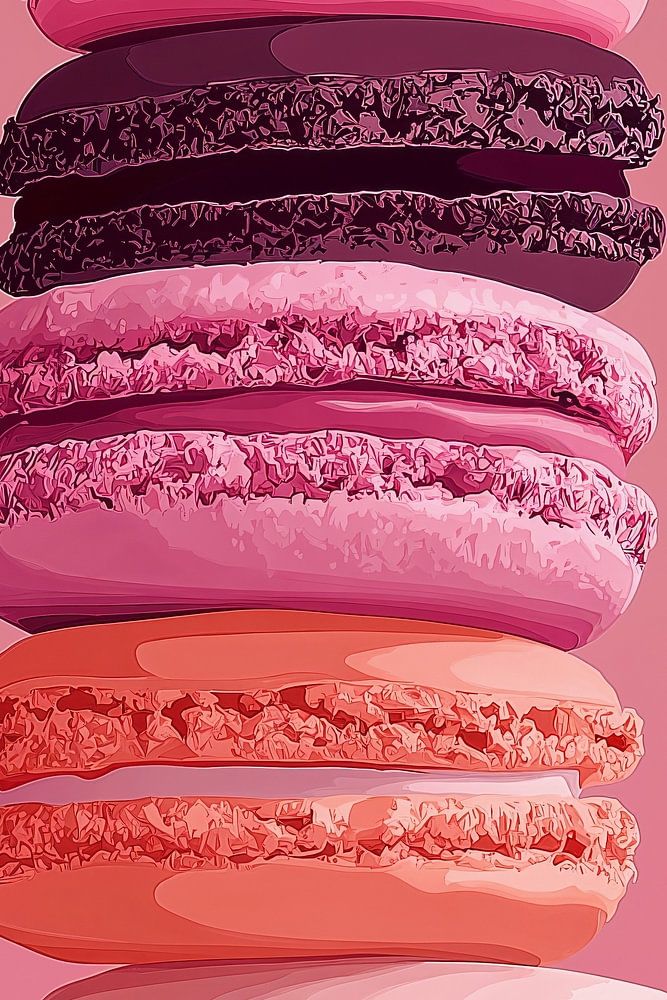 Une élégante pile de macarons parfaitement exécutés, déclinés dans différentes nuances de rose et de violet, photographiés sur un fond rose tendre. La composition respire le raffinement avec son subtil dégradé de couleurs allant du rose clair au corail et au violet profond, mettant magnifiquement en valeur la texture caractéristique des macarons dans ce décor minimaliste.