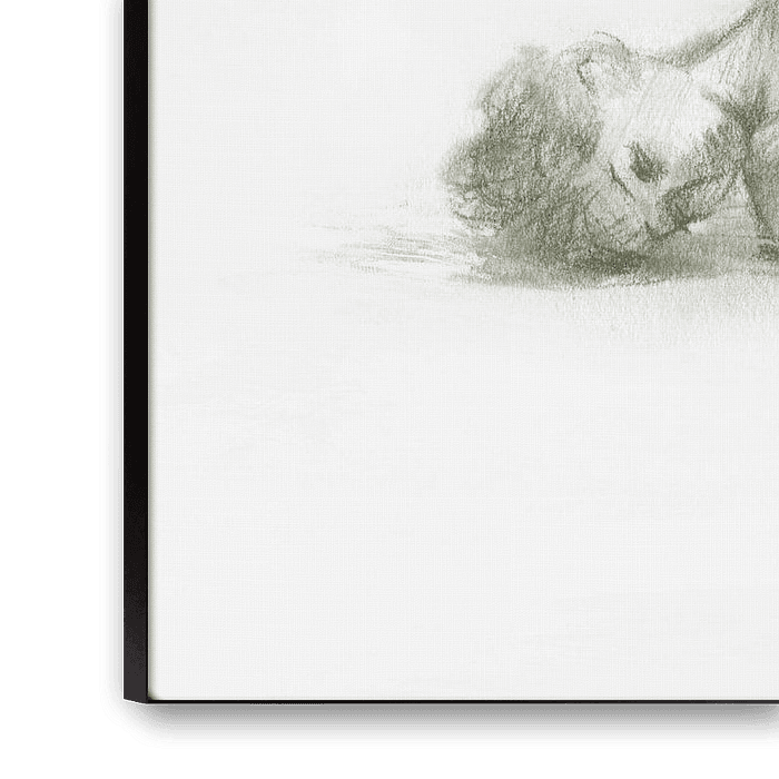 Esquisse d'une femme nue allongée. Sa tête repose sur le sol et ses genoux sont relevés. On voit comment les courbes de ses seins et de son abdomen se conforment à la gravité, et son corps touche le sol à plat. Son bras gauche repose sur sa hanche tandis que son bras droit est allongé le long de son corps.
