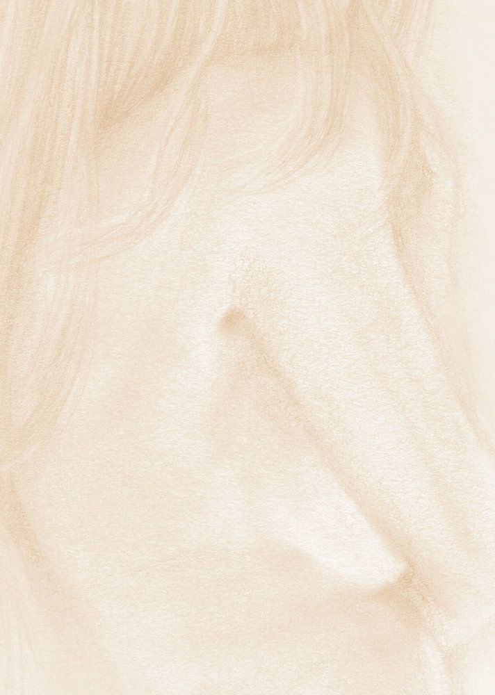 Dessin au crayon d'une jeune femme, vue de profil. Elle pose nue, son bras couvrant sa poitrine. Elle a de longs cheveux raides qui tombent joliment sur ses épaules. Rêveuse, elle regarde vers le bas à un angle où l'on voit une partie de son visage derrière ses longues mèches. On voit son corps jusqu'à la taille, les épaules légèrement relevées, ce qui lui donne un air romantique et innocent.