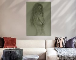 Dessin au crayon d'une jeune femme, vue de profil. Elle pose nue, son bras couvrant sa poitrine. Elle a de longs cheveux raides qui tombent joliment sur ses épaules. Rêveuse, elle regarde vers le bas à un angle où l'on voit une partie de son visage derrière ses longues mèches. On voit son corps jusqu'à la taille, les épaules légèrement relevées, ce qui lui donne un air romantique et innocent.