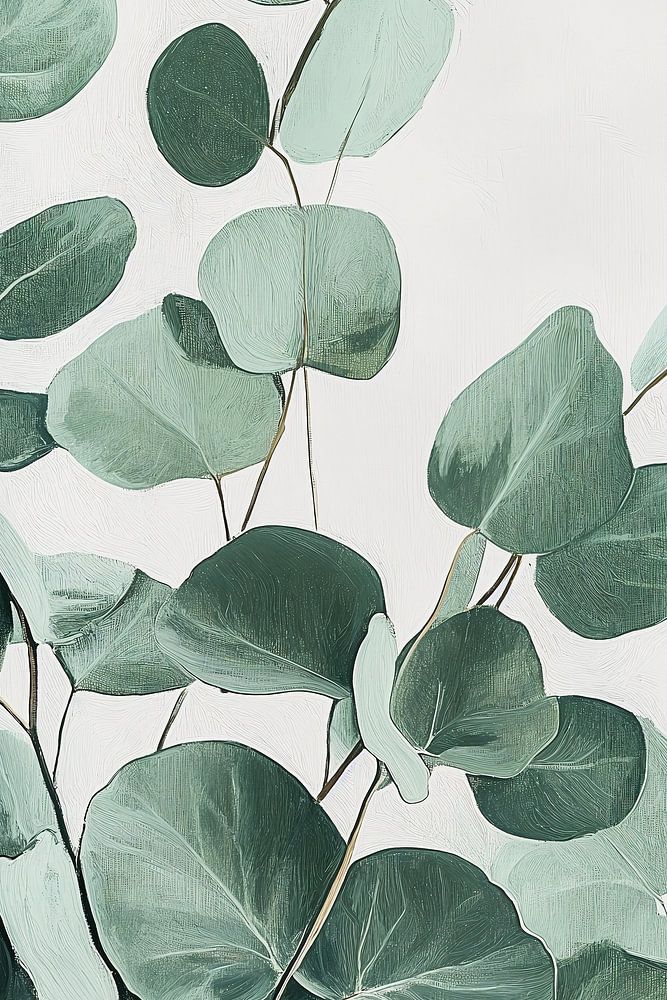 Une œuvre d’art botanique sereine dans des tons doux de vert menthe avec des feuilles d’eucalyptus flottant dans une composition aérienne sur un fond clair. Les branches délicates et les différentes transparences des feuilles créent un jeu apaisant d'ombre et de lumière, résultant en une image intemporelle et élégante qui s'intègre parfaitement dans un intérieur moderne.
