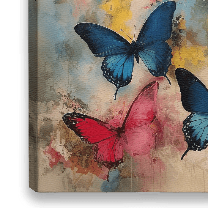 Une peinture numérique colorée avec une explosion rêveuse de papillons colorés. L'œuvre donne un aspect rêveur et classique à votre intérieur !