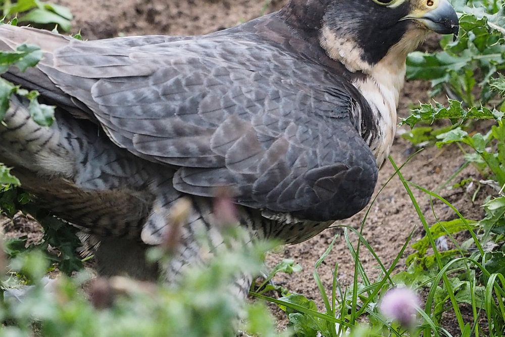 Le faucon pèlerin est un grand faucon d'une taille moyenne de 43 cm. Ils ont un dessous clair avec des bandes transversales et un dos gris foncé. Il y a une large bande de barbe noire. Chez la sous-espèce F. peregrinus peregrinus, le dos est gris foncé et les parties sont crème avec des taches foncées, les joues sont blanches et la bande de barbe foncée (typique pour tous les faucons) est clairement visible. Les pattes sont jaunes, le bec bleu-noir et déjà incurvé à partir de la base du bec.
