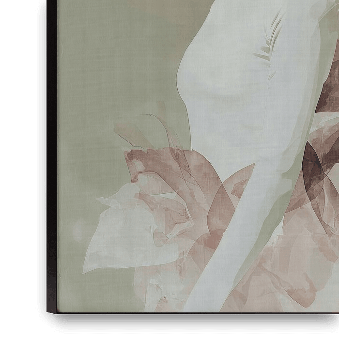 Un portrait sensuel d'une femme de profil, vêtue d'un col roulé blanc minimaliste, dont la silhouette se fond harmonieusement avec de délicats motifs floraux et végétaux aux douces nuances de rose et de beige. L'œuvre joue avec brio sur la transparence et la superposition, brouillant la frontière entre le corps et la nature pour créer…