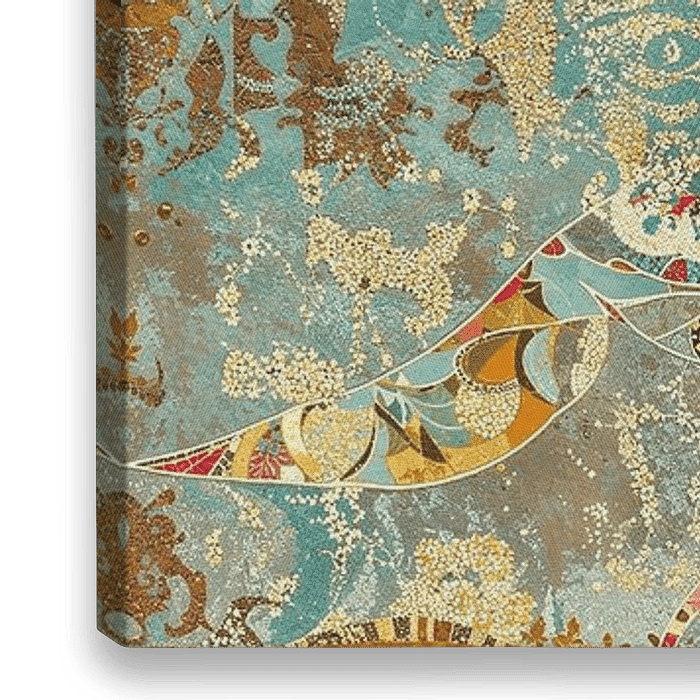 Couleurs : or, turquoise, noir, blanc, rouge, vert, marron, beige