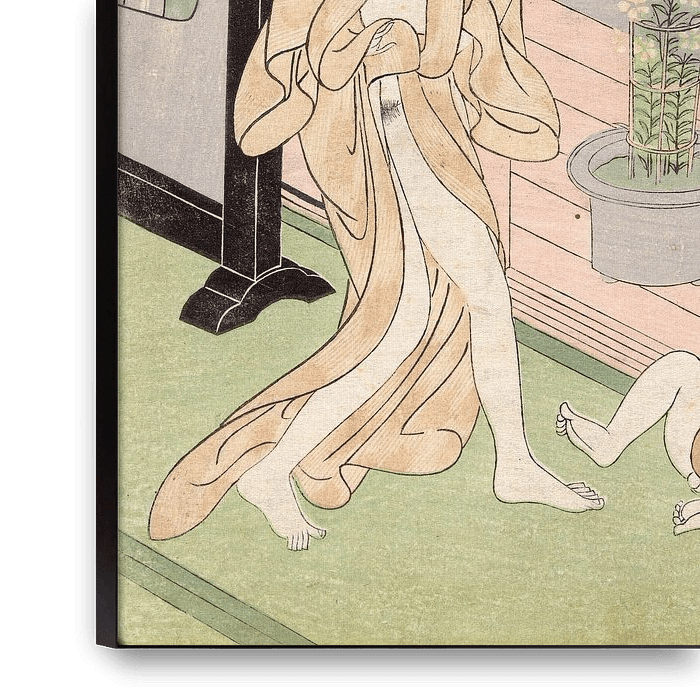 Femme nue avec une blouse matinale ouverte, marchant vers un enfant assis près de fleurs cueillies ; sur le porche, un pot de fleurs derrière lequel se trouve une vue du jardin. Poème en haut de l'impression.