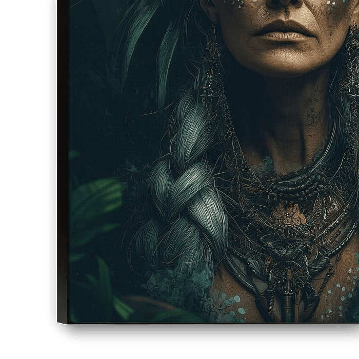 Un portrait puissant où mysticisme et nature se fondent dans une composition époustouflante. Les touches turquoise et les points lumineux sur la peau créent une aura magique, tandis que l'impressionnante coiffe de plumes et d'éléments naturels s'harmonise parfaitement avec le fond vert foncé. Les cheveux gris argenté tressés et les bijoux tribaux richement ornés complètent l'ensemble, une œuvre d'art intemporelle alliant puissance primitive et esthétique raffinée.