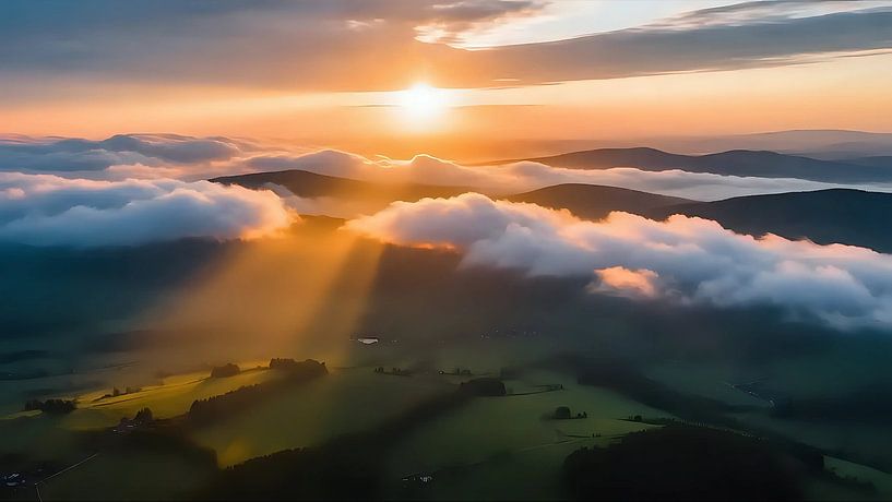 La photo haute résolution, prise depuis la perspective d'un drone, montre une scène à couper le souffle où les nuages majestueux dominent le paysage. Le soleil, bas sur l'horizon, rayonne de tons chauds, dorés et orangés, plongeant le ciel dans un jeu de couleurs spectaculaire. Les rayons du soleil couchant traversent les épais nuages,…