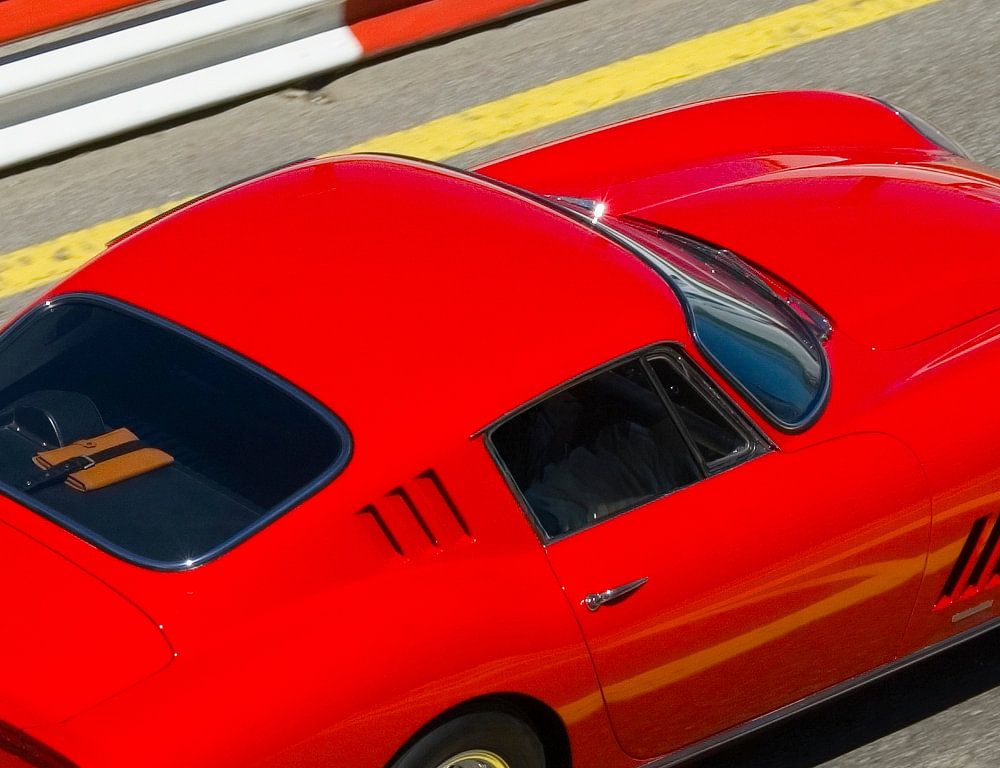 La Ferrari 275 GTB, grand tourisme classique, roulant sur un circuit de course, vue du ciel.