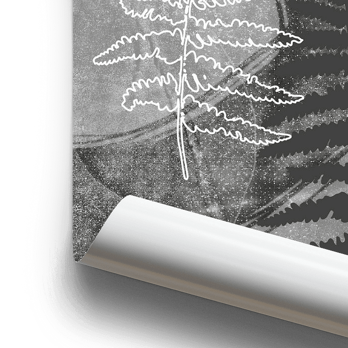 Illustration botanique abstraite avec des feuilles de fougère, des formes organiques, des textures et des marques.