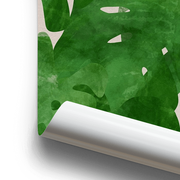 Art mixte botanique moderne. Feuilles de Monstera deliciosa. Couleur verte riche, texture délicate, fond neutre. Parfait pour une chambre à coucher, un salon, une salle de travail, un hall ou un jardin. Style de vie romantique, basique, scandinave, design, rural.