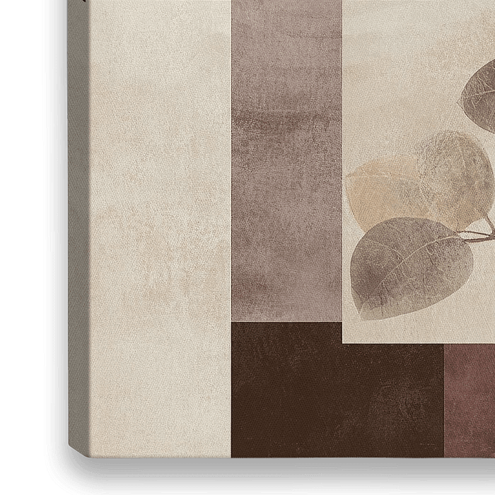 Feuilles abstraites - Il s'agit d'une peinture botanique représentant des feuilles qui se détachent élégamment sur un fond de formes abstraites dans des tons ocres, ce qui confère à l'ensemble un aspect moderne et serein.