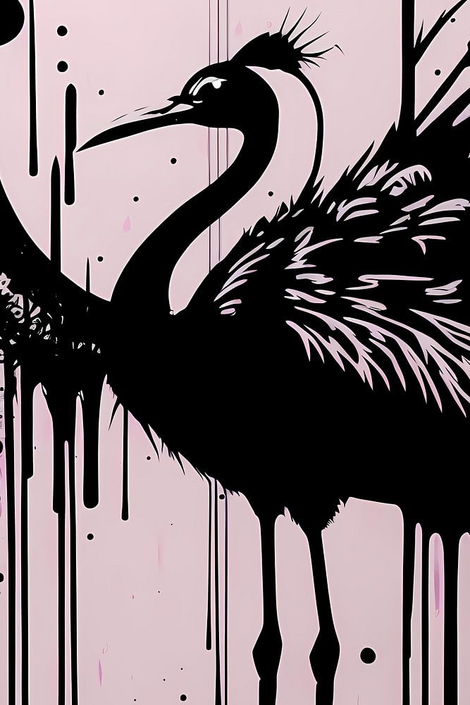 Flamingo in Contrast est une œuvre audacieuse qui combine l'essence des styles de l'art moderne et du street art. L'image monochrome puissante, avec un fond violet et rose saisissant, capture l'élégance d'un flamant en une seule forme stylisée. Les effets d'éclaboussures et de gouttes de peinture ajoutent un élément dynamique et vibrant à l'œuvre, qui conviendrait parfaitement à un bureau contemporain ou à un salon moderne. Cette œuvre d'art capte l'imagination et invite le spectateur à approfondir les détails abstraits, laissant une impression durable.