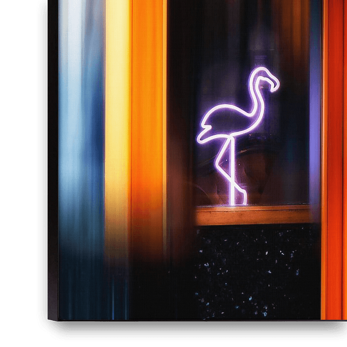 Travail photographique abstrait. Le flamant rose éclairé au néon placé devant la vitrine a inspiré la transformation de celle-ci en article de club.