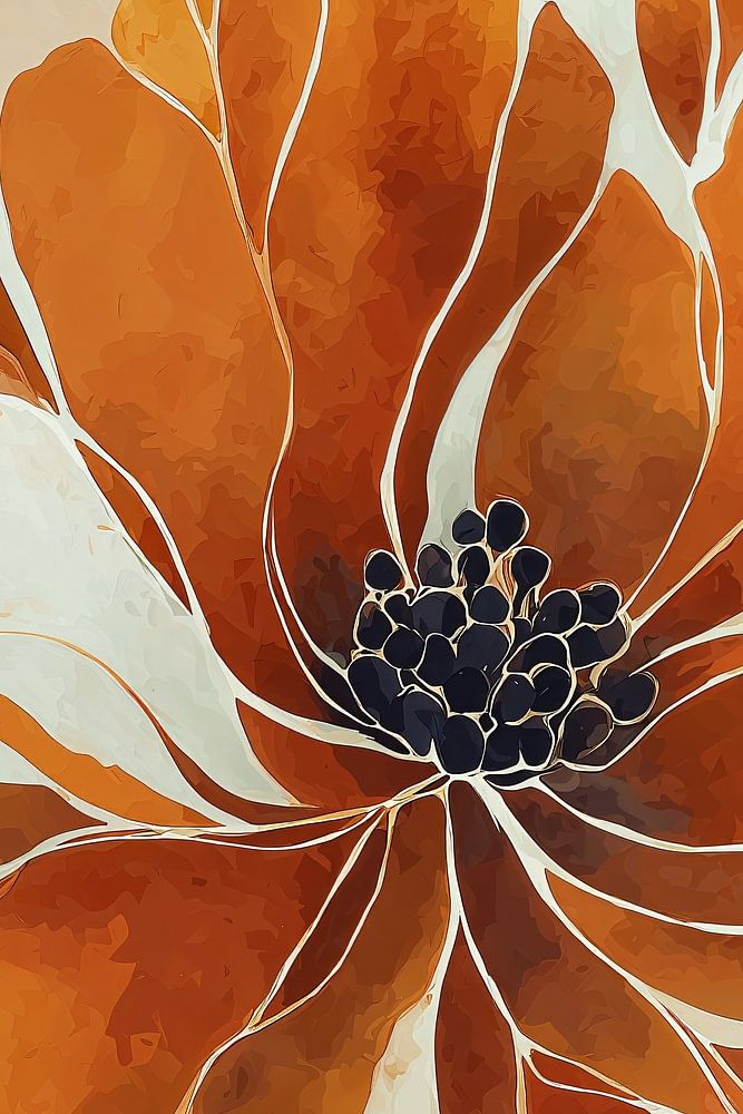 Illustration botanique d'une grande fleur aux tons orange chauds sur un fond clair et neutre. Les pétales sont rendus par une subtile technique d'aquarelle, les nervures blanches créant un délicat contraste avec l'orange intense. Le cœur sombre de la fleur constitue un point focal fort de la composition.