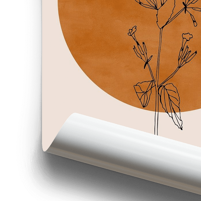 Art mural botanique moderne. Fleur en art linéaire sur fond terracotta et beige clair. Art floral semi-abstrait minimaliste avec un peu d'ambiance rétro. Parfait pour un salon, une chambre, une salle d'attente, une salle de travail, un jardin ou un hall. Style de vie bohème, zen, scandinave, basique, nouveau rural, romantique.