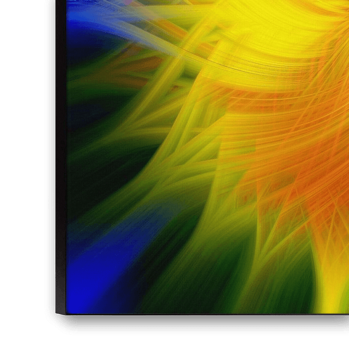 Achetez cette œuvre d'art abstraite Fleur de lumière. Art abstrait géométrique coloré en jaune, orange, bleu. par Dina Dankers sur toile, aluminium, ArtFrame ou photographie (encadrée), impression d'art en haute qualité et tout format.
