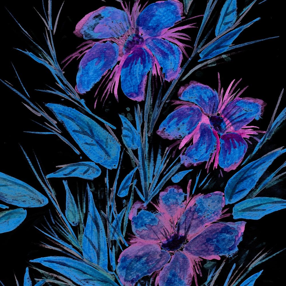 œuvre d'art traditionnelle représentant des fleurs de couleur bleue et violette sur un fond noir.