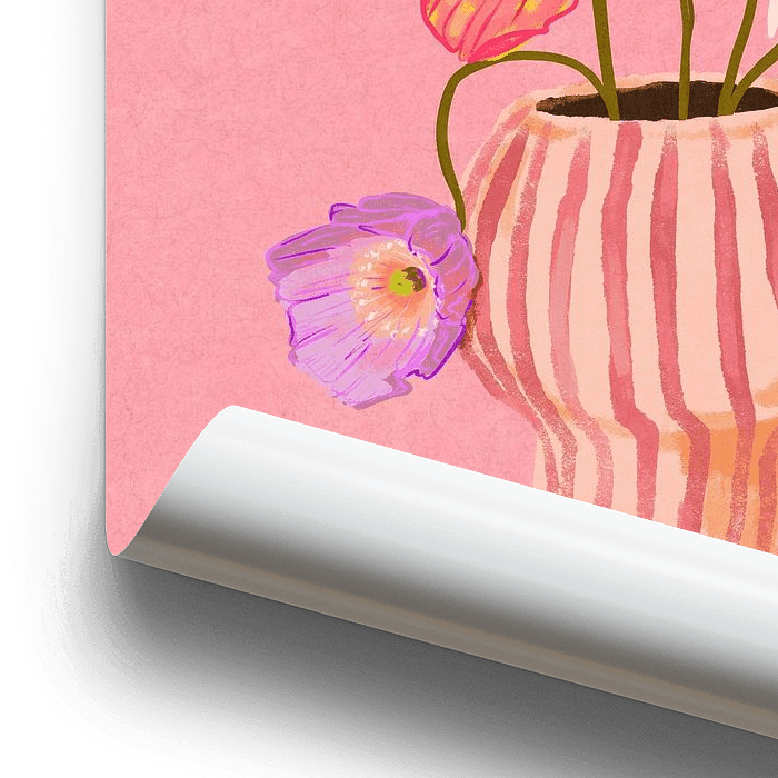 Illustration colorée de fleurs dans un vase rayé sur fond rose.