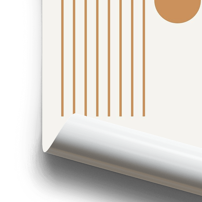 Affiche rétro 70 vintage style Bauhaus avec des formes géométriques en jaune doré chaud sur fond blanc cassé. Art moderne minimaliste.