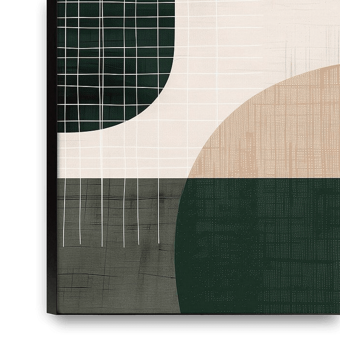 Cette œuvre associe des formes géométriques et organiques épurées dans un jeu de contrastes et de textures. Les tons vert profond et beige doux offrent une image riche et chaleureuse, tandis que le motif de la maille ajoute des détails intéressants. Cette œuvre attirerait l'attention dans un intérieur minimaliste, et les couleurs…