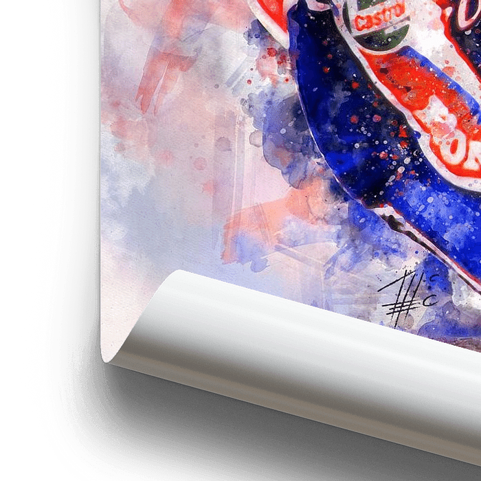 Peintures d'une série de motos légendaires et de leurs pilotes intrépides. Peint à l'aquarelle sur papier.