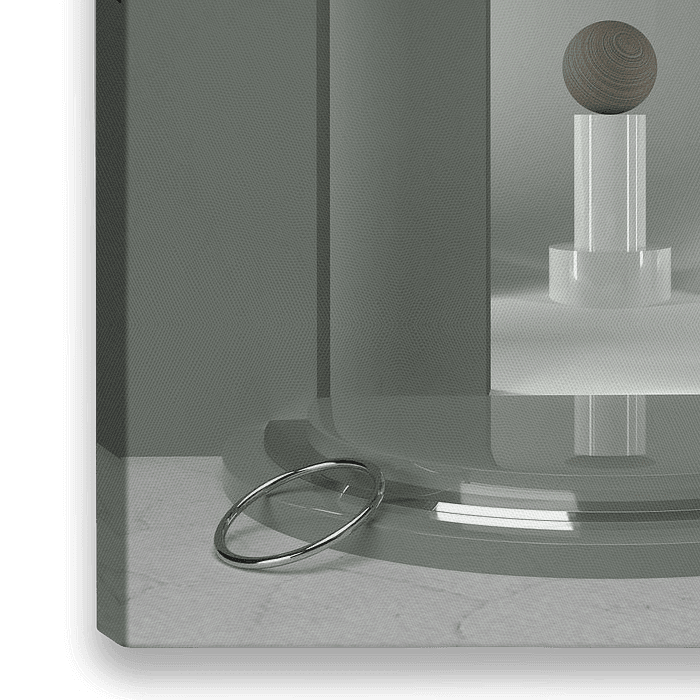 Vue abstraite tridimensionnelle de 3 arcs décalés vers un ornement en bois au loin. Des accents de métal et de lumière ludique.