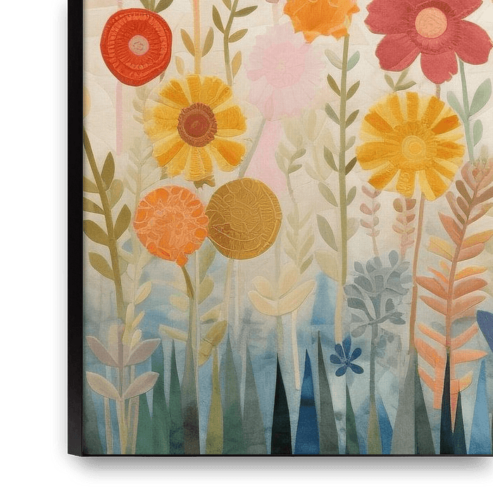 Gazelle dans une mer de fleurs Titre de référencement : Gazelle moderne | - Vous voyez ici une scène attachante d'une gazelle entourée d'un champ de fleurs coloré, capturée dans un style ludique et moderne. La gazelle occupe une place centrale sur la toile, dans un paysage paisible et géométrique où les couleurs orange, rose, jaune et diverses nuances de vert créent une atmosphère chaleureuse. L'utilisation remarquable de motifs et de textures confère à l'œuvre un caractère presque tangible.