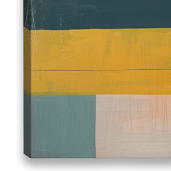 Geometric Calm | Urban Calm - Cette peinture abstraite présente une composition de blocs géométriques dans une palette apaisante de gris, de beige et de bleu foncé, avec une bande jaune frappante qui ajoute du dynamisme.