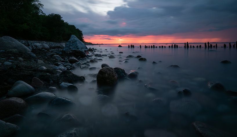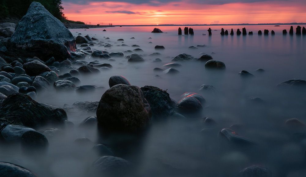 Glowe, Rügen C'est le soir, le soleil vient de se coucher. Une partie du ciel d'un orange vif au-dessus de l'horizon disparaît lentement sous l'effet des averses qui envahissent le champ de vision depuis la droite du ciel. Des pierres brillantes, juste au-dessus ou au-dessous de la surface de l'eau au premier plan, reflètent ici et là…