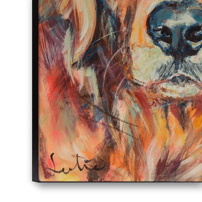 Impressionnante peinture d'un grand portrait d'un chien Golden Retriever. Ce homard vous regarde d'un air interrogateur et crée une atmosphère agréable. Utilisation chaleureuse des couleurs. Il y a beaucoup de touches de jaune et d'orange dans ce tableau, peint par Liesbeth Serlie. Cette œuvre d'art est, par exemple, également très adaptée à la chambre des enfants.