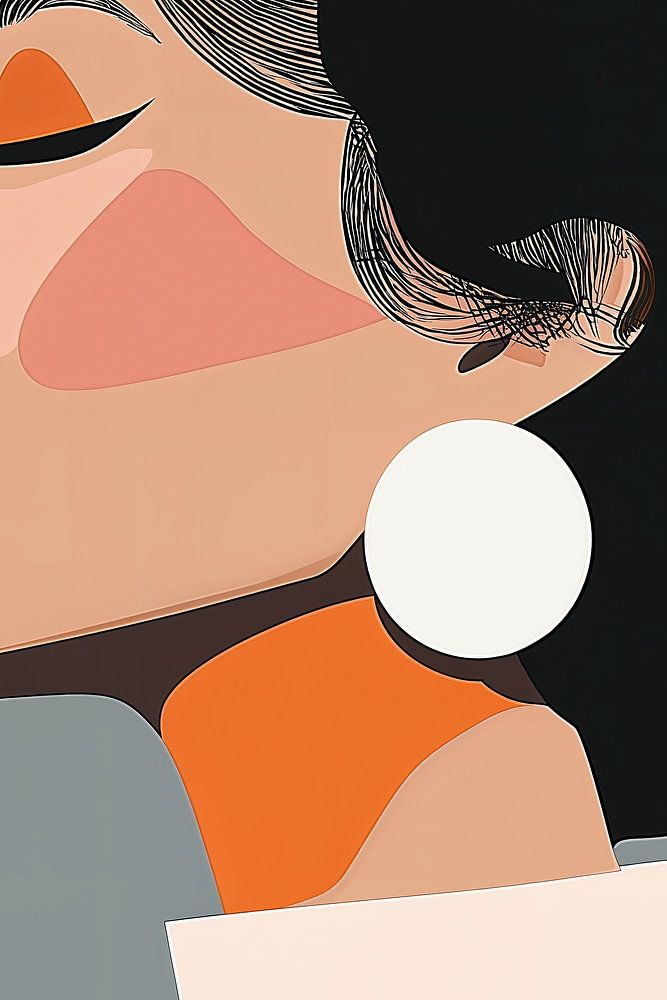 Un portrait minimaliste élégant en vue latérale qui capture l'essence du glamour vintage avec une touche moderne. L'illustration montre une composition élégante avec des éléments de signature : un raccourci spectaculaire, une boucle d'oreille tendance et un accent orange audacieux sur un fond gris discret. Les lignes douces et l’utilisation des couleurs créent une atmosphère intemporelle à la fois rétro et contemporaine.
