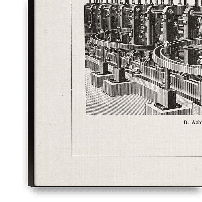 Cette plaque ancienne en noir et blanc représente une impressionnante machine à broyer. La tôle est très bien détaillée.