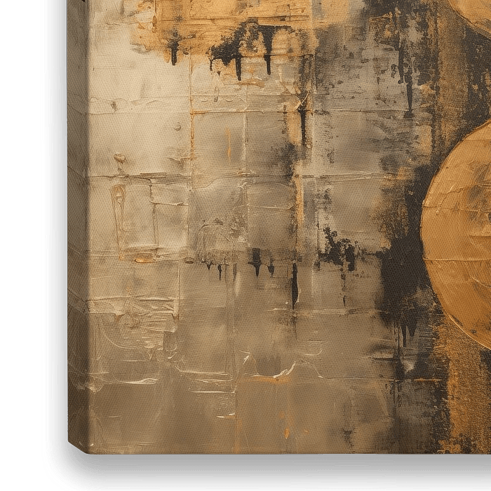 capture l'équilibre et l'interaction entre les éléments noir et or de cette œuvre. La texture appliquée numériquement ajoute de la profondeur et de la complexité à l'œuvre.