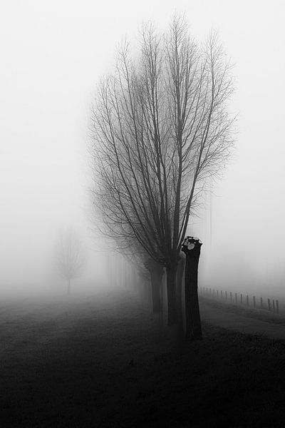 Paysage avec 3 arbres dans un brouillard dense. Les arbres de devant et de derrière ont été taillés court. La photo a été éditée en noir et blanc et à fort contraste.
