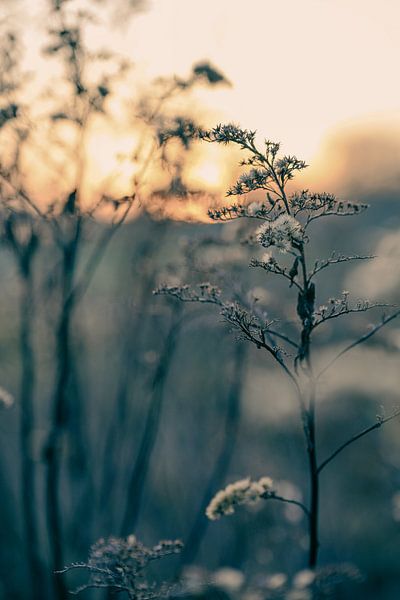 Gros plan sur la verge d'or tardive, une plante qui pousse à l'état sauvage dans la plaine inondable du Rhin inférieur et dont les belles feuilles duveteuses apparaissent en hiver. Le soleil se lève en arrière-plan.