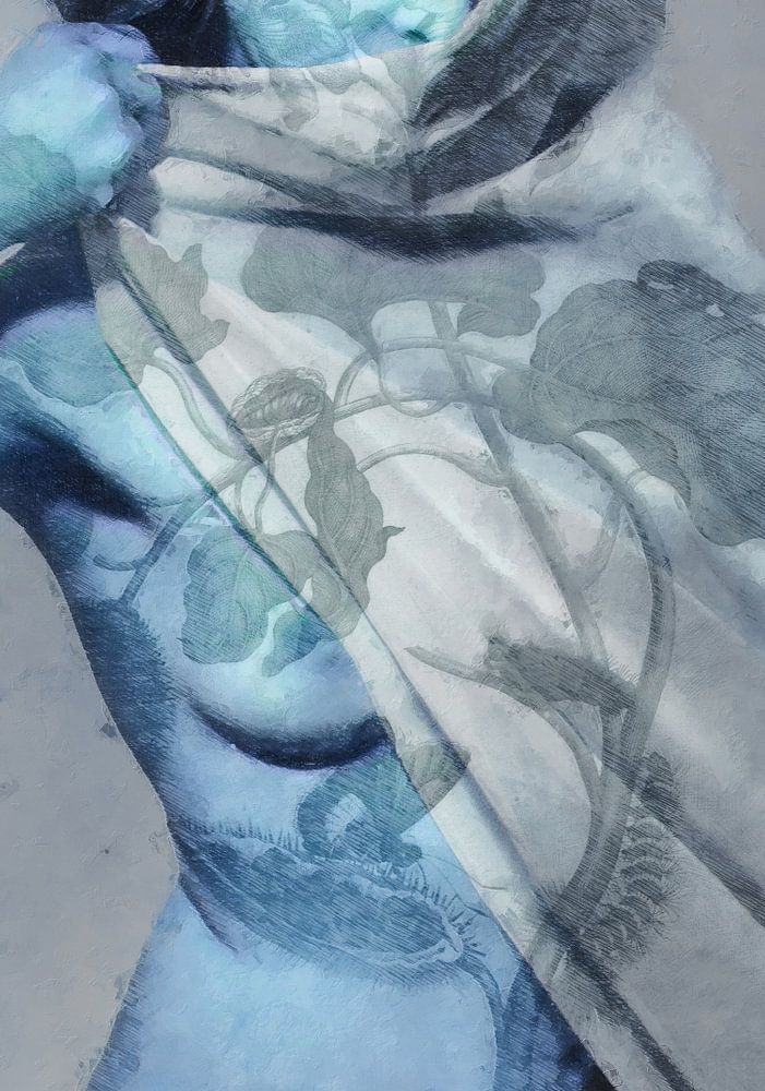 Montage van studio-sessie met model samen versmolten met werk van Maria Sibylla