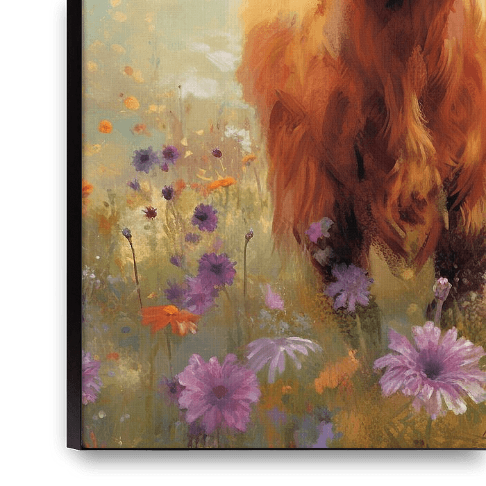Peinture à l'huile, vue de face d'une adorable vache Highland dans un champ de fleurs sauvages, portraits réalistes à l'huile, style réaliste fantaisiste coloré, coups de pinceau fins, pelage lisse et longues cornes, éclairage doux, couleurs rêveuses, yeux clairs et expression heureuse.