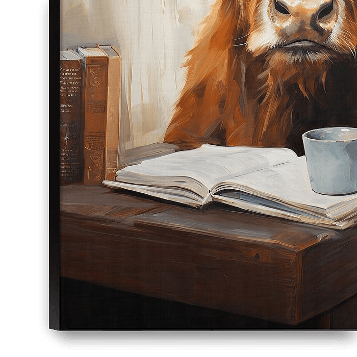 Plongez dans l'univers enchanteur des Highlands écossais avec cette œuvre d'art exceptionnelle représentant une vache des Highlands lisant tranquillement un livre. Cette charmante vache, symbole de calme, de savoir et de sagesse, incarne l'esprit de la nature écossaise intacte. Son épais pelage hirsute, sa douce sérénité et la scène…
